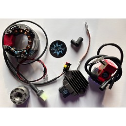 l'allumage peut être utilisé sans batterie (le client devra quantifier la consommation de son propre système électrique s'il est compatible avec la quantité correcte produite) ou en le connectant à une batterie rechargeable (choix recommandé), même petite, à laquelle le système électrique de la moto/scooter etc. peut être connecté.